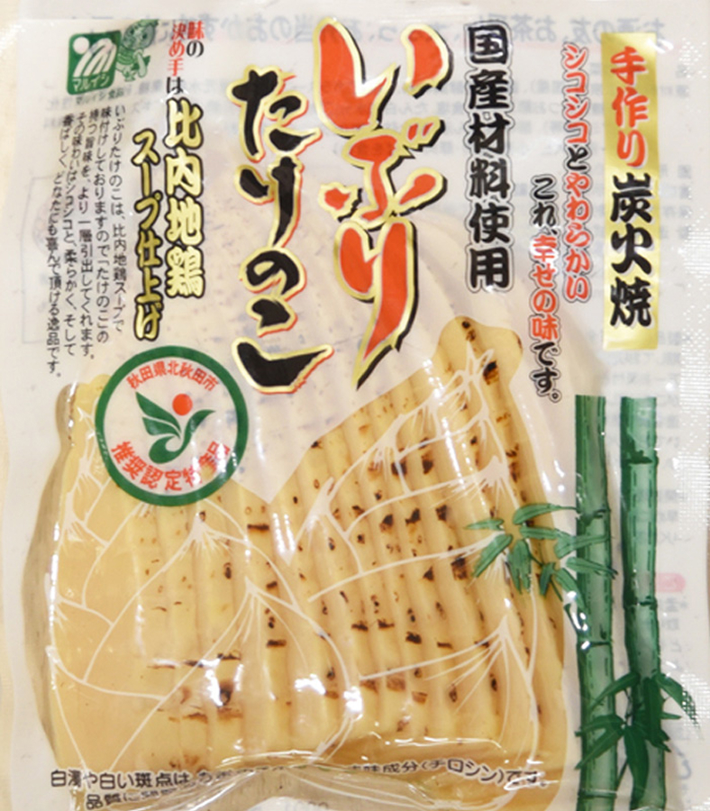 全国商工会連合会主催「2019年むらおこし特産品コンテスト」受賞、「北秋田市特産品推奨認定商品」 秋田地方に古くから伝わる「いぶりがっこ」のように、上質の「たけのこ」だけを遠赤外線でじっくりと焼き上げました。 比内地鶏スープで味付けしておりますので、「たけのこ」の持つおいしさをより一層引き出しております。 香ばしく柔らかくシコシコと…、どなた様にもよろこんでいただける新食感の旨さはまさに秋田の新名物です。