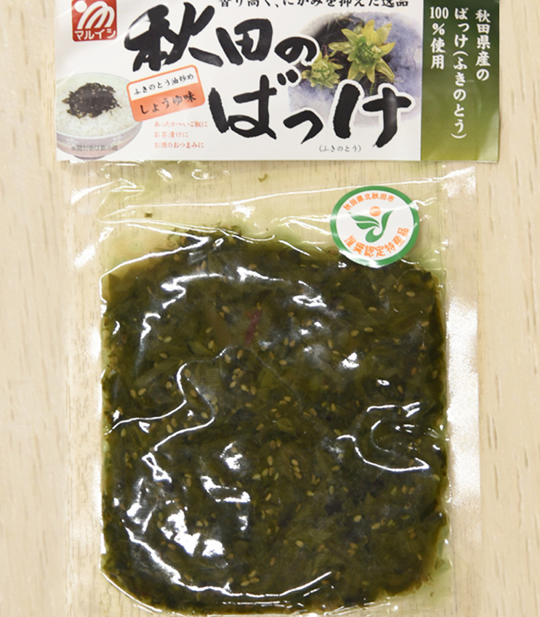 秋田のばっけは、ふきのとうを油で炒めたお惣菜で、ちょっとほろ苦く香り引き立つ大人の味です。苦さは、ビール位になるように調整しております。ふきのとう独特の苦味をおさえ、ばっけを油で炒めて、美味しく仕上げることができました。一度食べると、おいしいとご好評をいただいております。 秋田のばっけは、そのまま温かいご飯のおかずやおにぎりの具としてお召し上がりいただくほか、お茶漬けや日本酒・焼酎等のお酒の肴としてもお召し上がりいただけます。